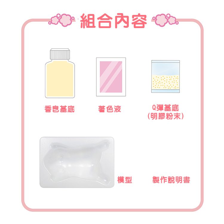 肥皂基底 - 水、皂基、起泡劑DEA、CAPB椰子油起泡劑、香料、二丙二醇(DPG)、日本晚櫻萃取物、甘油、氯化鈉、檸檬酸、丁二醇(BG)、乙二胺四乙酸(EDTA-4Na)有色液體 - 甘油、水、顏料