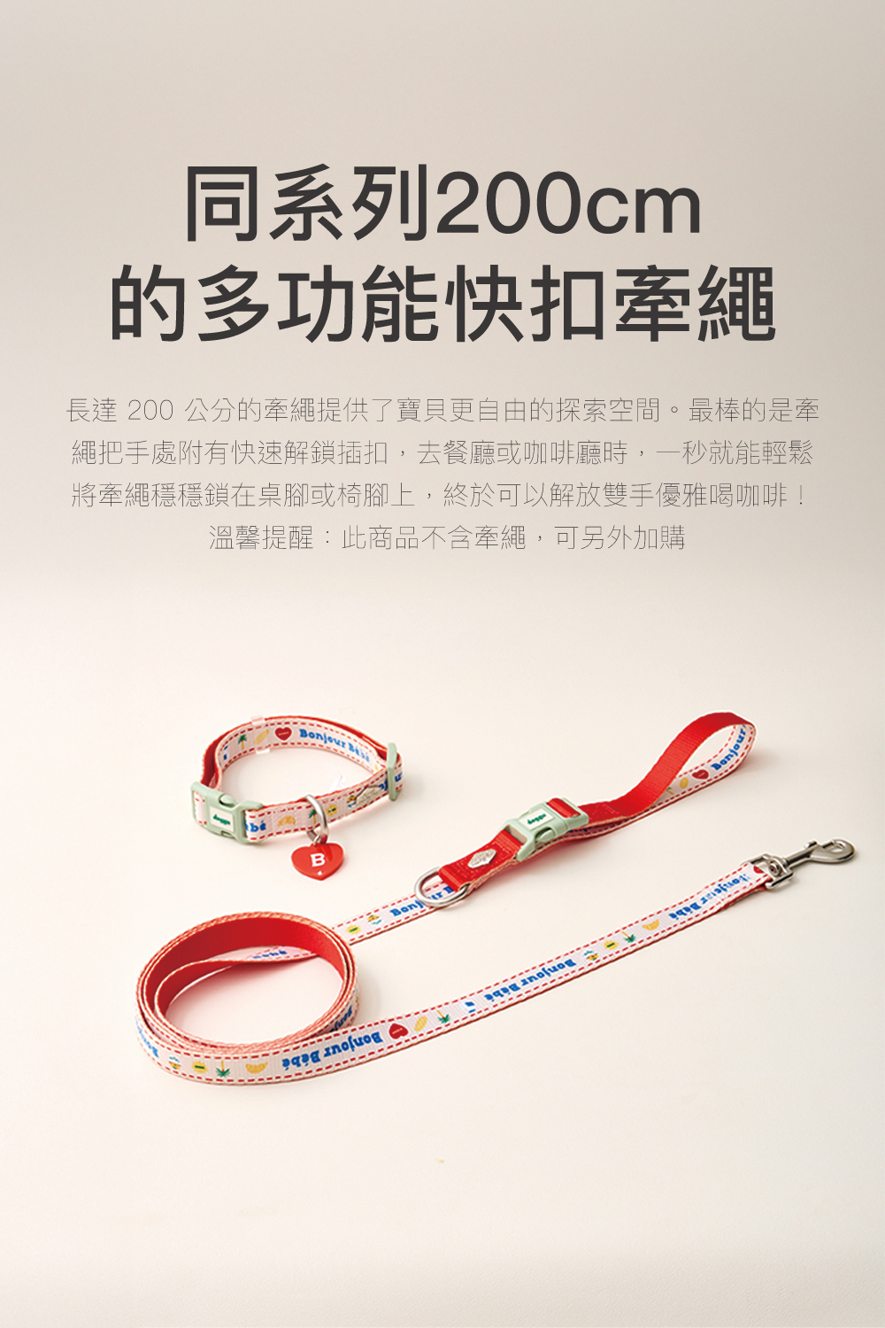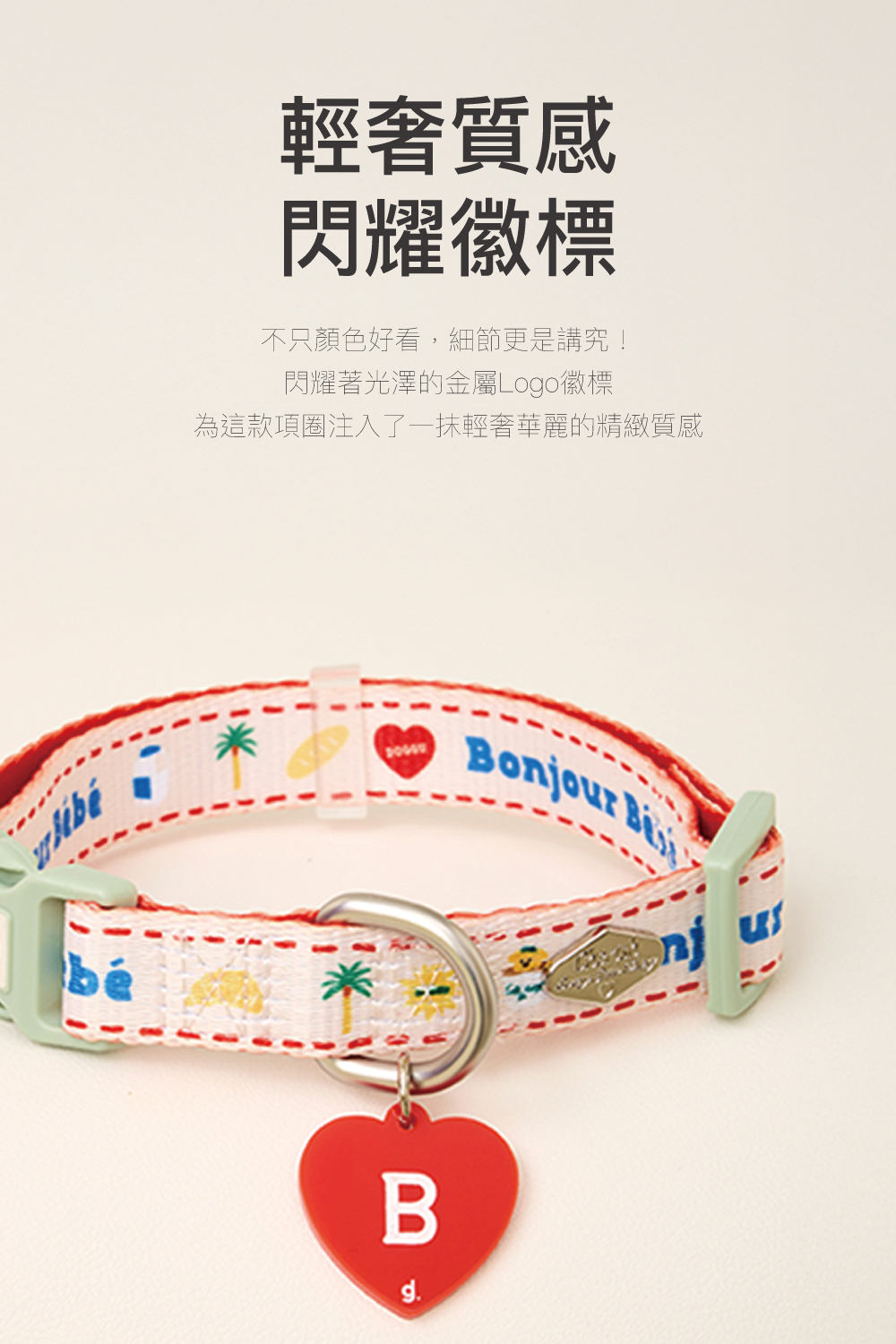 「Bonjour Bebe 輕奢項圈牽繩組」將為你完美還原法式夏日渡假風情!這套不僅採用了超吸睛的質感撞色設計,更在細節處點綴了閃亮的「鋅合金專屬 Logo」,散發出滿滿的高級感。採用極致親膚柔軟的織帶材質,好穿戴且不傷寶貝肌膚。牽出門,你家寶貝就是整條街上最優雅的法式小名媛 / 小紳士!