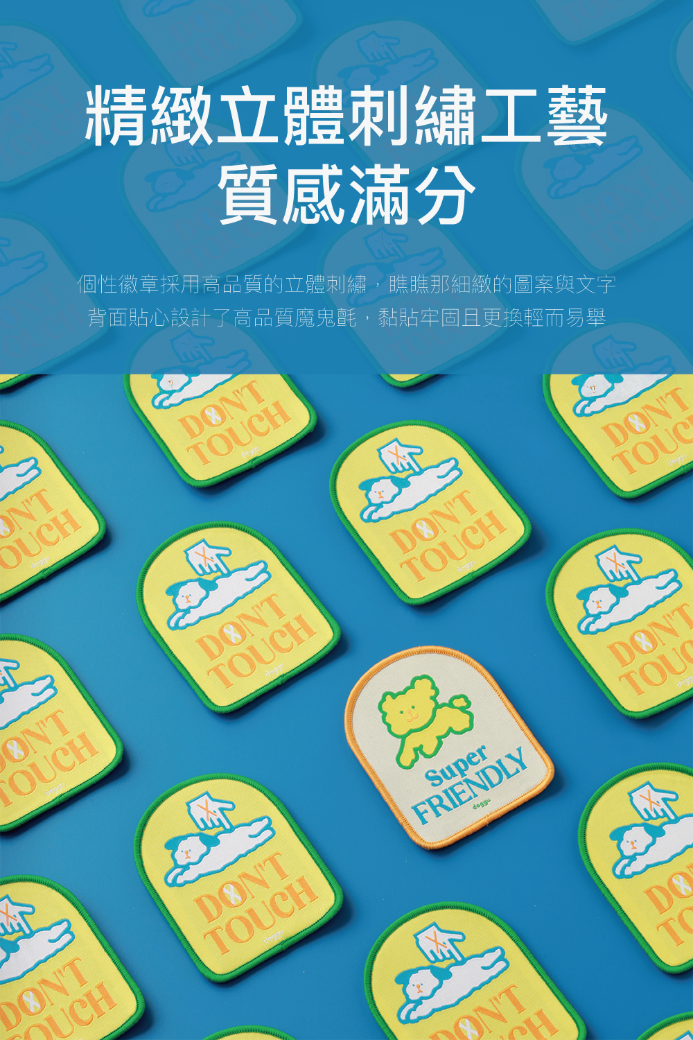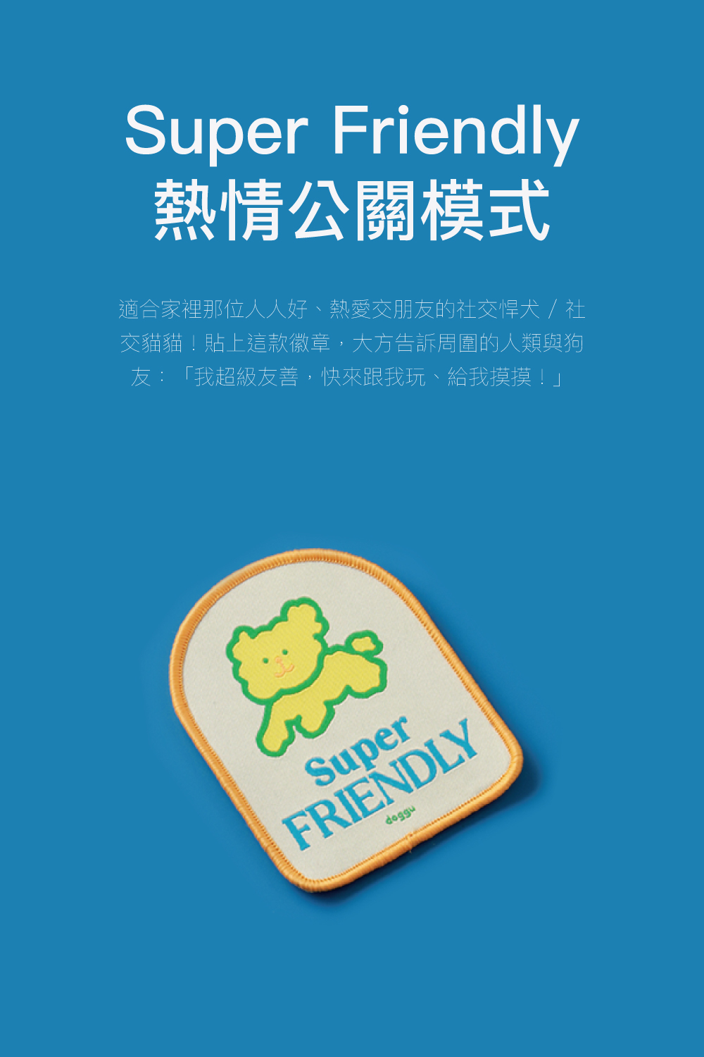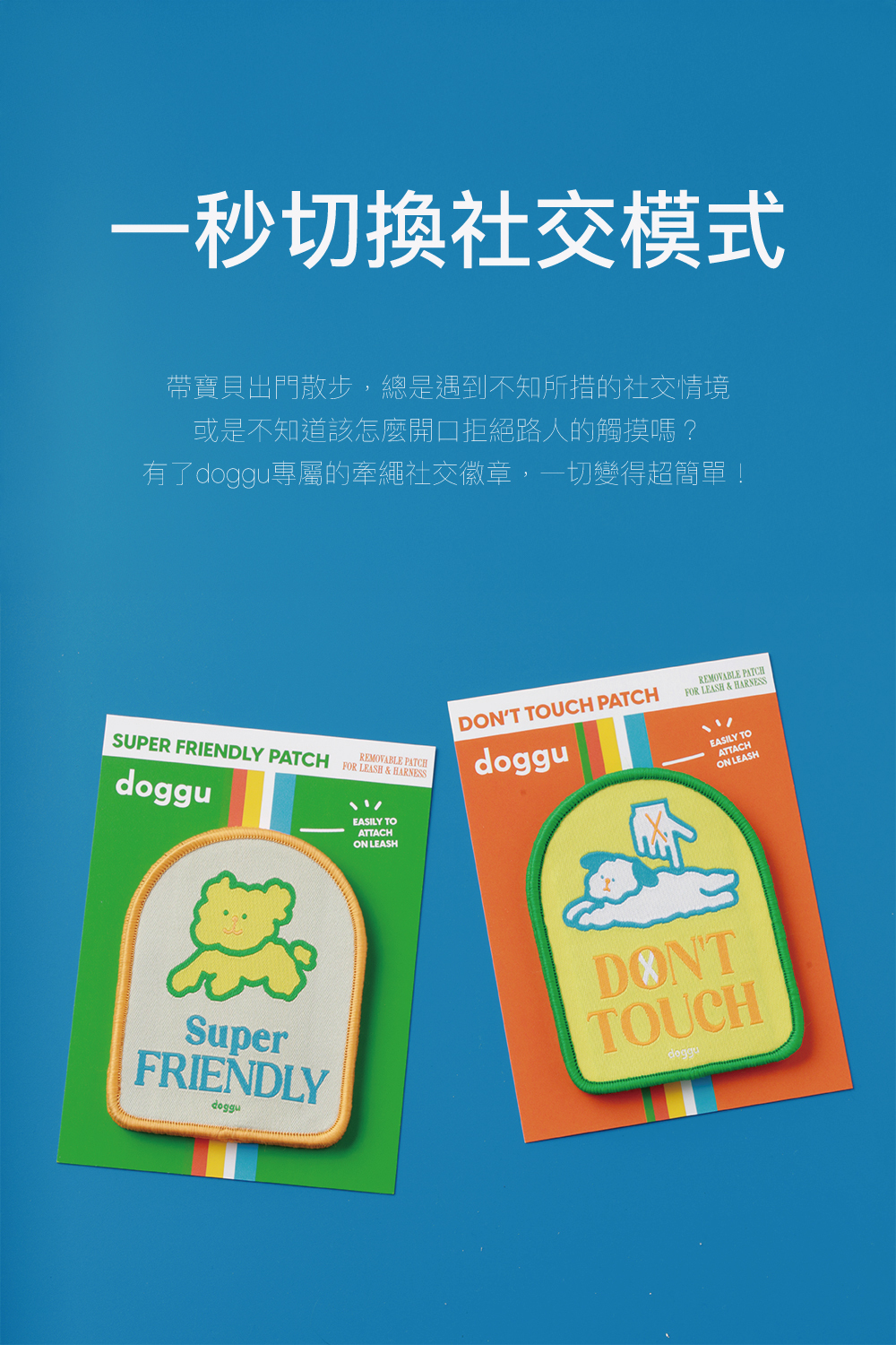 有了doggu專屬的牽繩社交徽章,一切變得超簡單!這系列特別推出了Super Friendly與Do Not Touch兩款直白又吸睛的設計。字體醒目加上精緻的刺繡工藝,遠遠就能讓路人秒懂寶貝當下的狀態。直接化解人類開口解釋的尷尬,絕對是 I 人家長與敏感毛孩的散步救星!