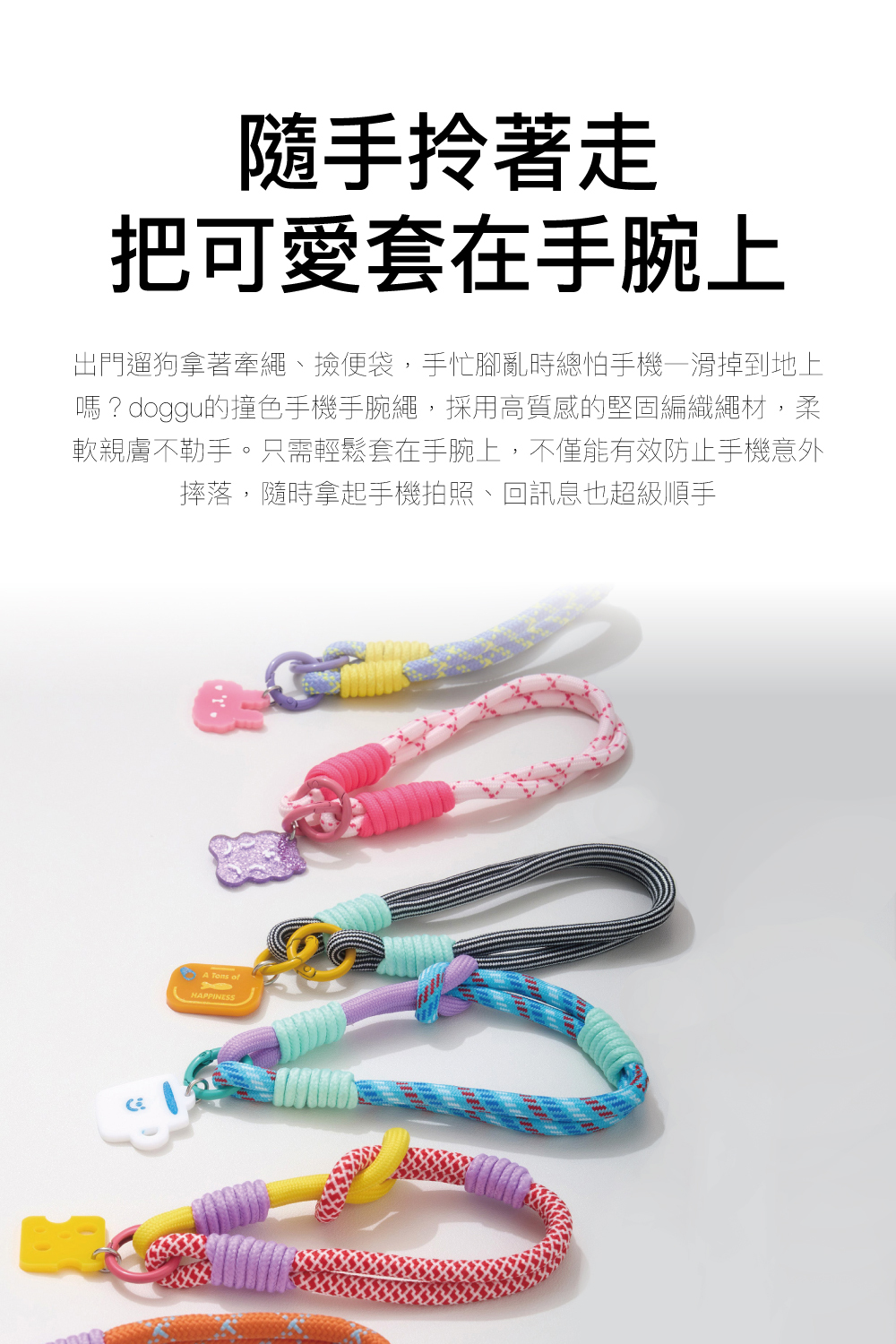 出門遛狗拿著牽繩、撿便袋,手忙腳亂時總怕手機一滑掉到地上嗎?doggu兼具實用與顏值的撞色手機手腕繩!採用高質感的堅固編織繩材,柔軟親膚不勒手。只需輕鬆套在手腕上,不僅能有效防止手機意外摔落,隨時拿起手機拍照、回訊息也超級順手