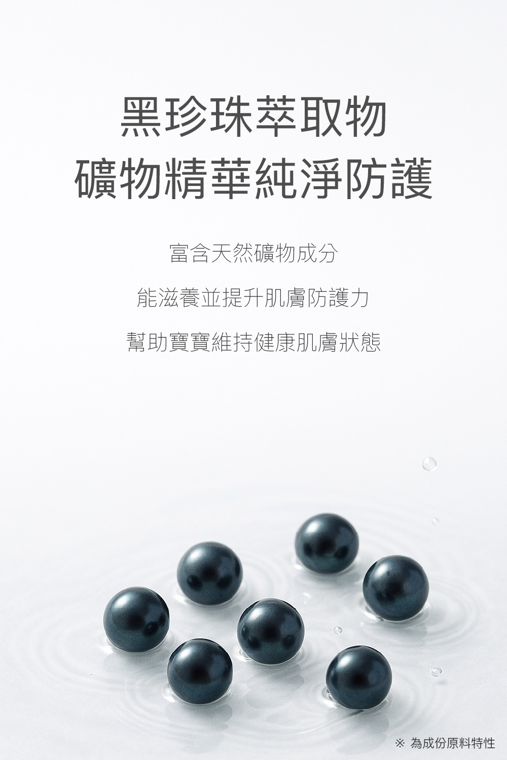 • 添加黑珍珠萃取物,富含礦物精華,給予寶寶純淨防護