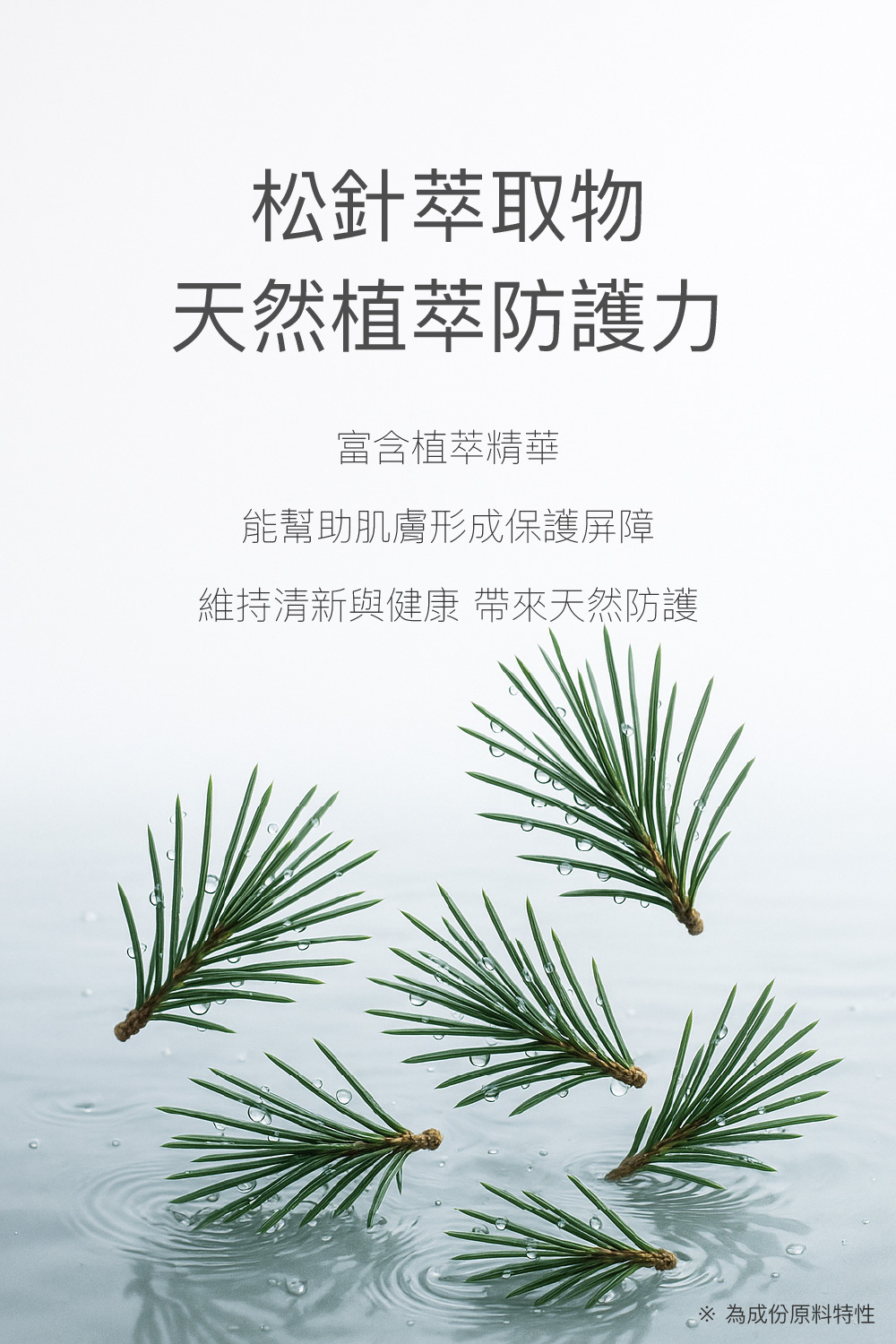 • 添加松針萃取物,天然防護力,清新肌膚