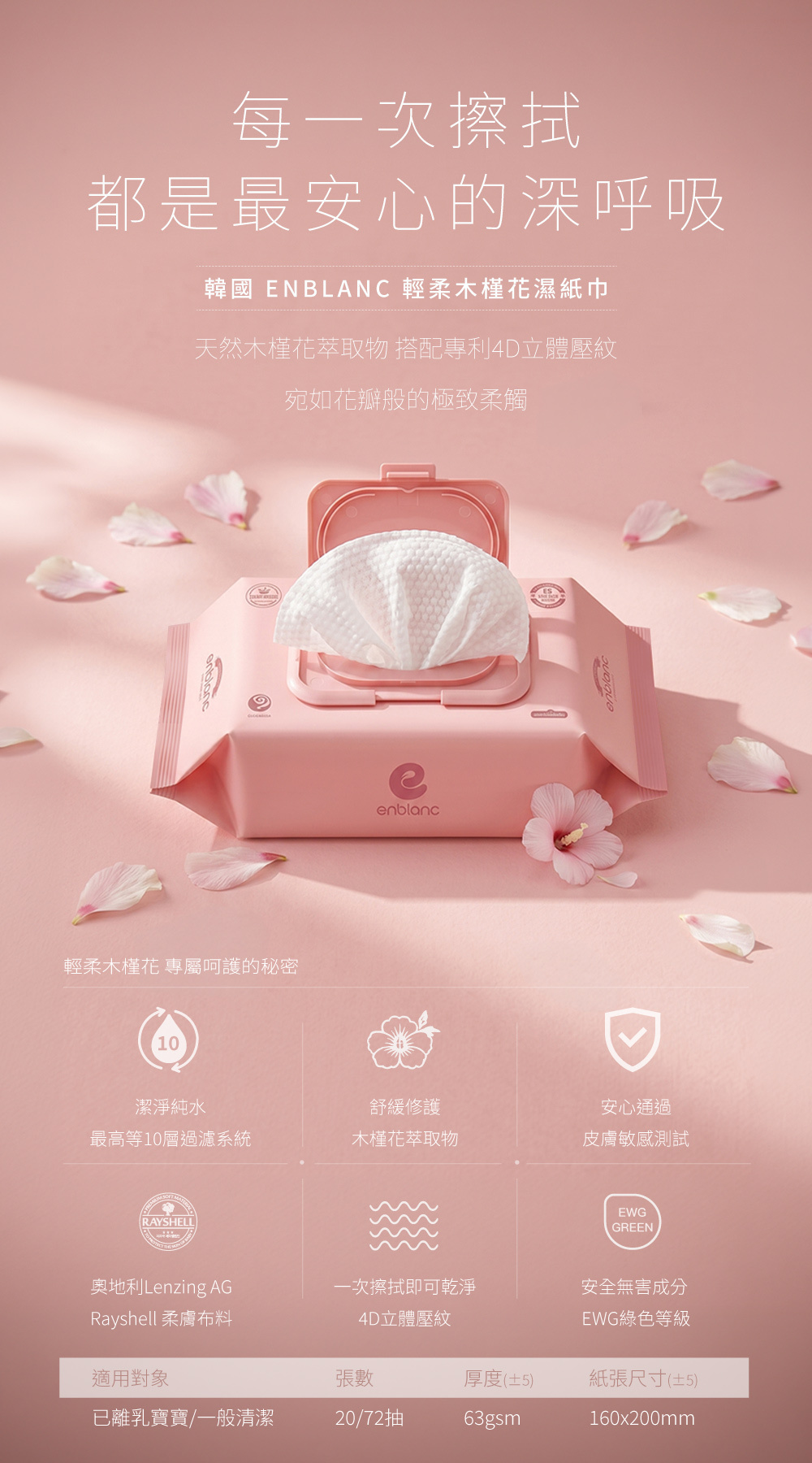 ENBLANC 銀離子抗菌|輕柔木槿花| 無蓋隨身包純水濕紙巾|20抽12包