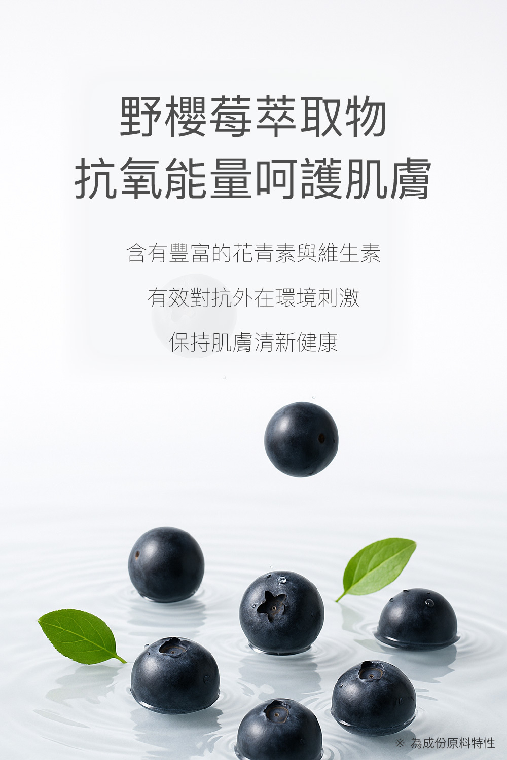 • 添加野櫻莓萃取物,富含花青素,抗氧亮澤