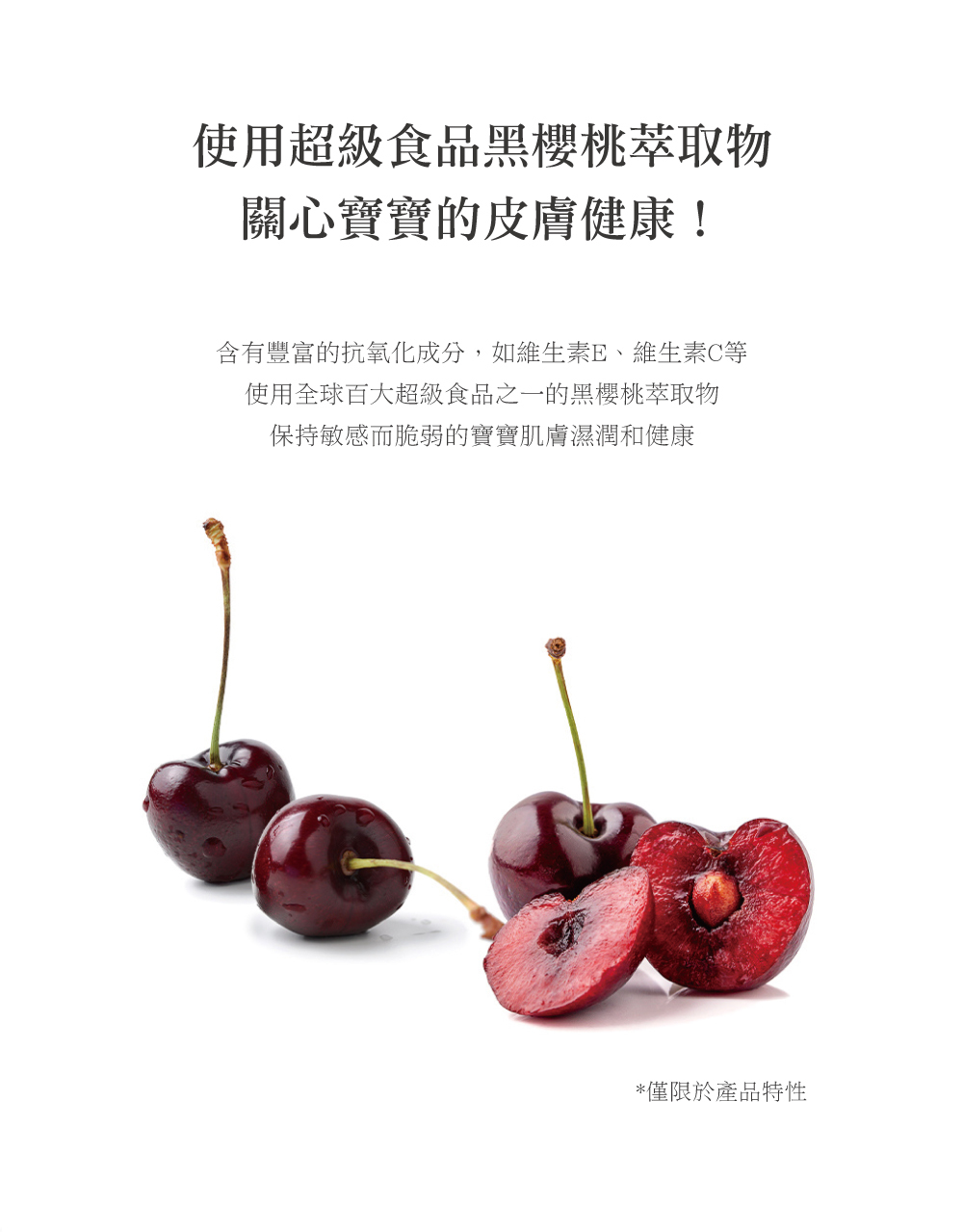 • 添加黑櫻桃萃取物,富含維生素與花青素,潤澤修護