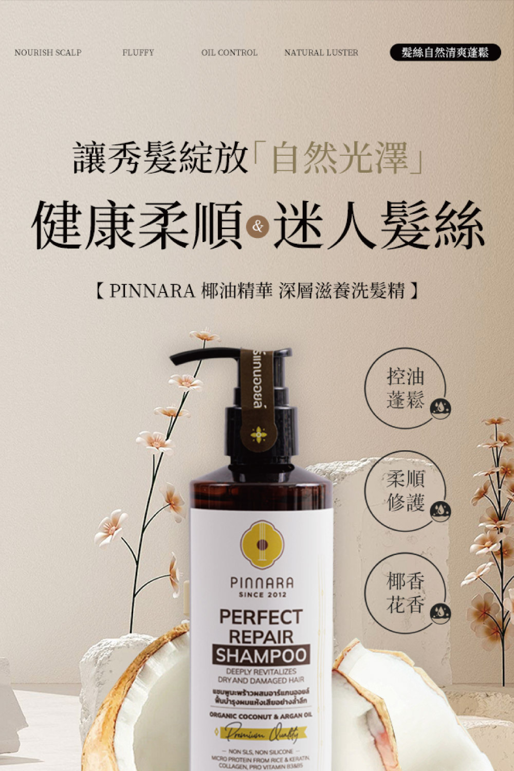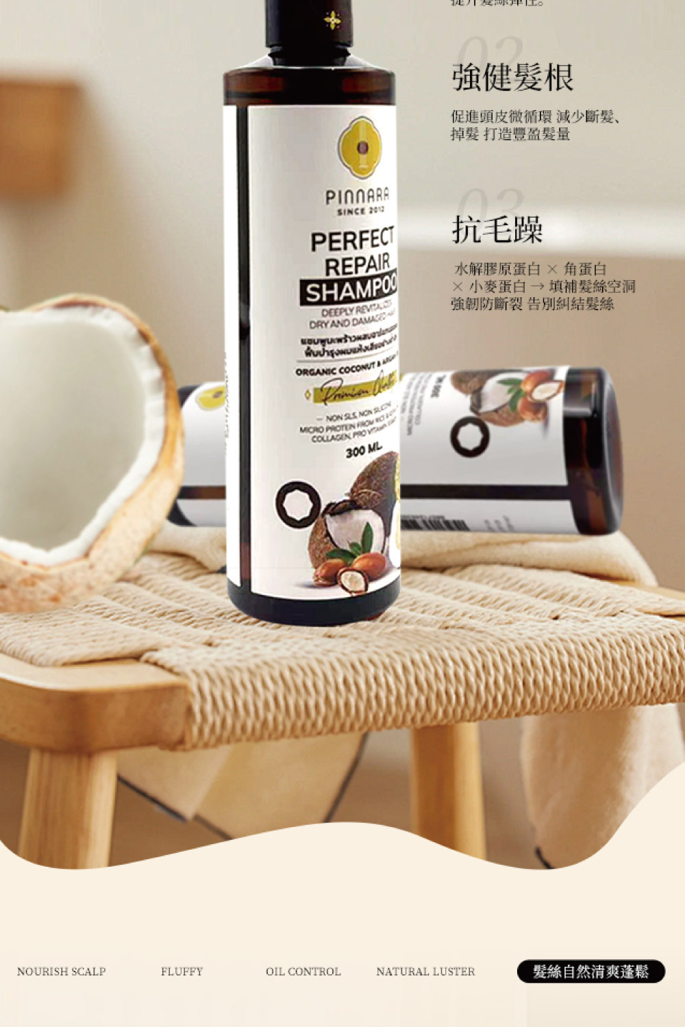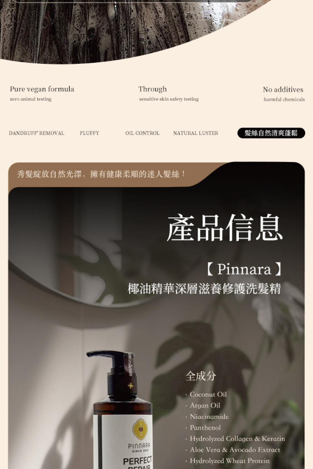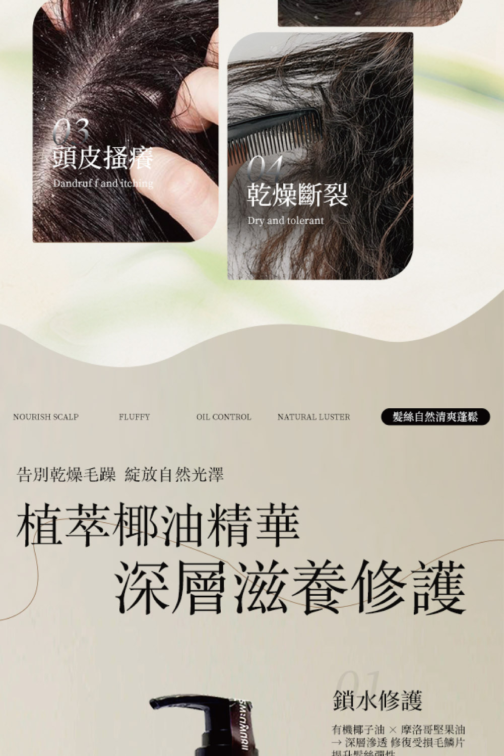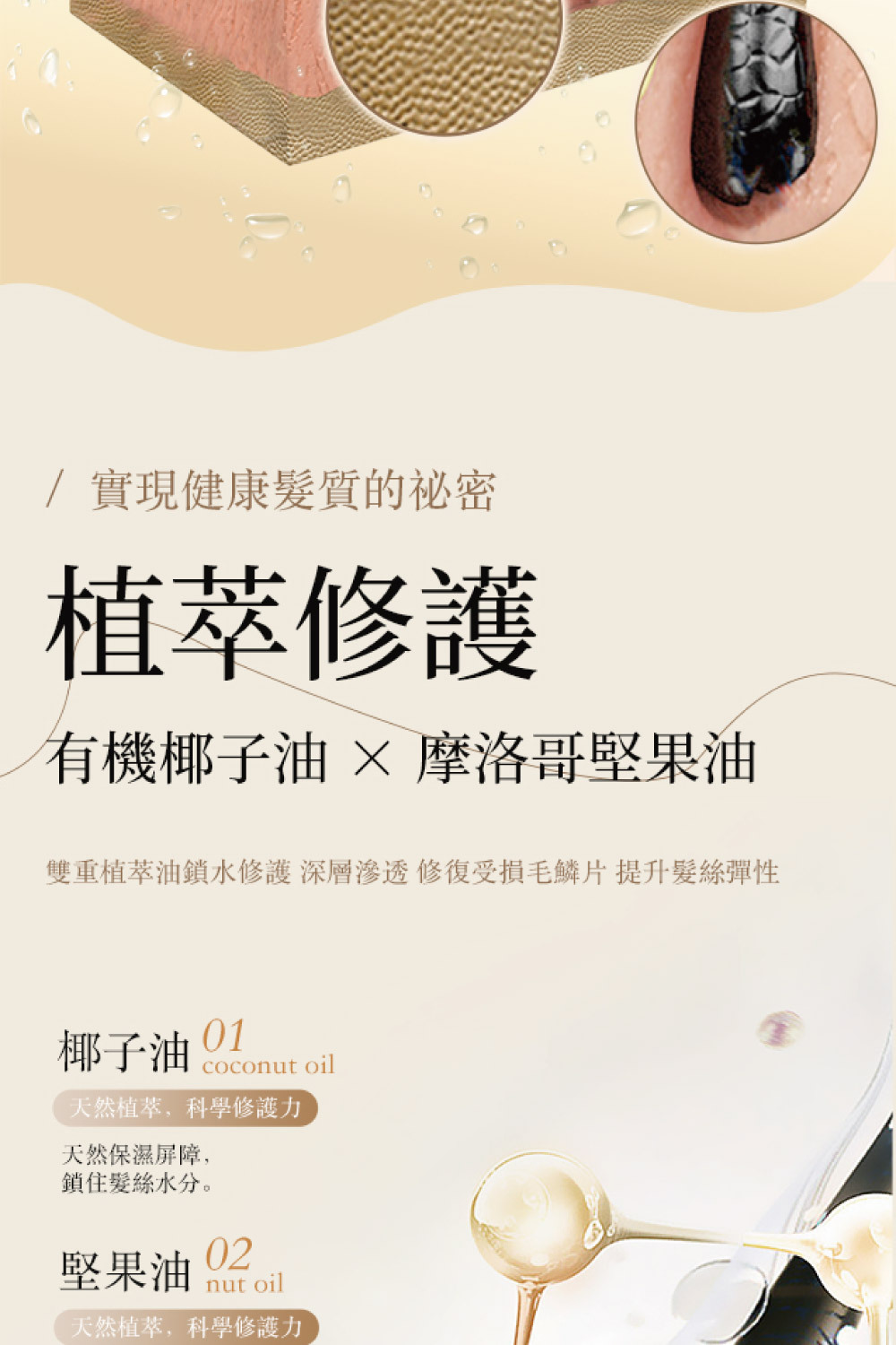 • 採用有機椰子油及摩洛哥堅果油,深層滋養秀髮,使髮絲柔順有光澤