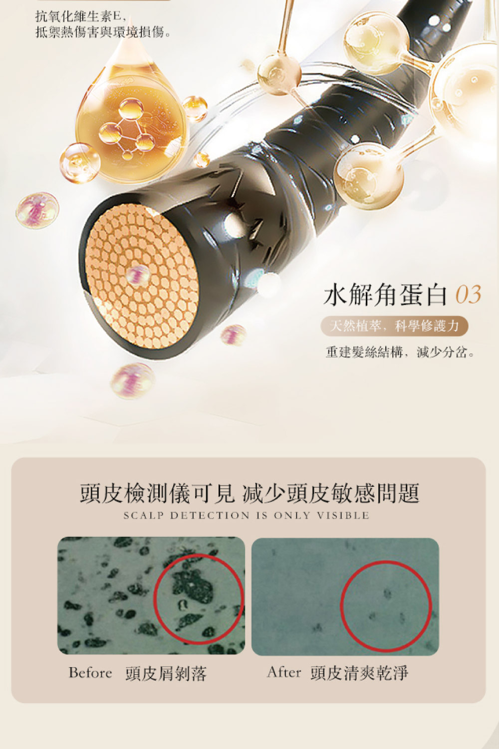 • 富含 維生素 B5 及 B3,修護受損髮質,增強髮根強韌度