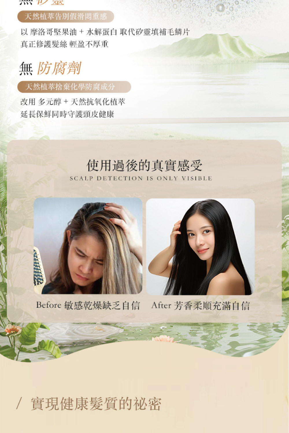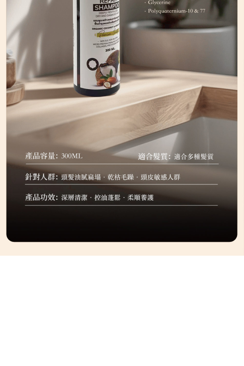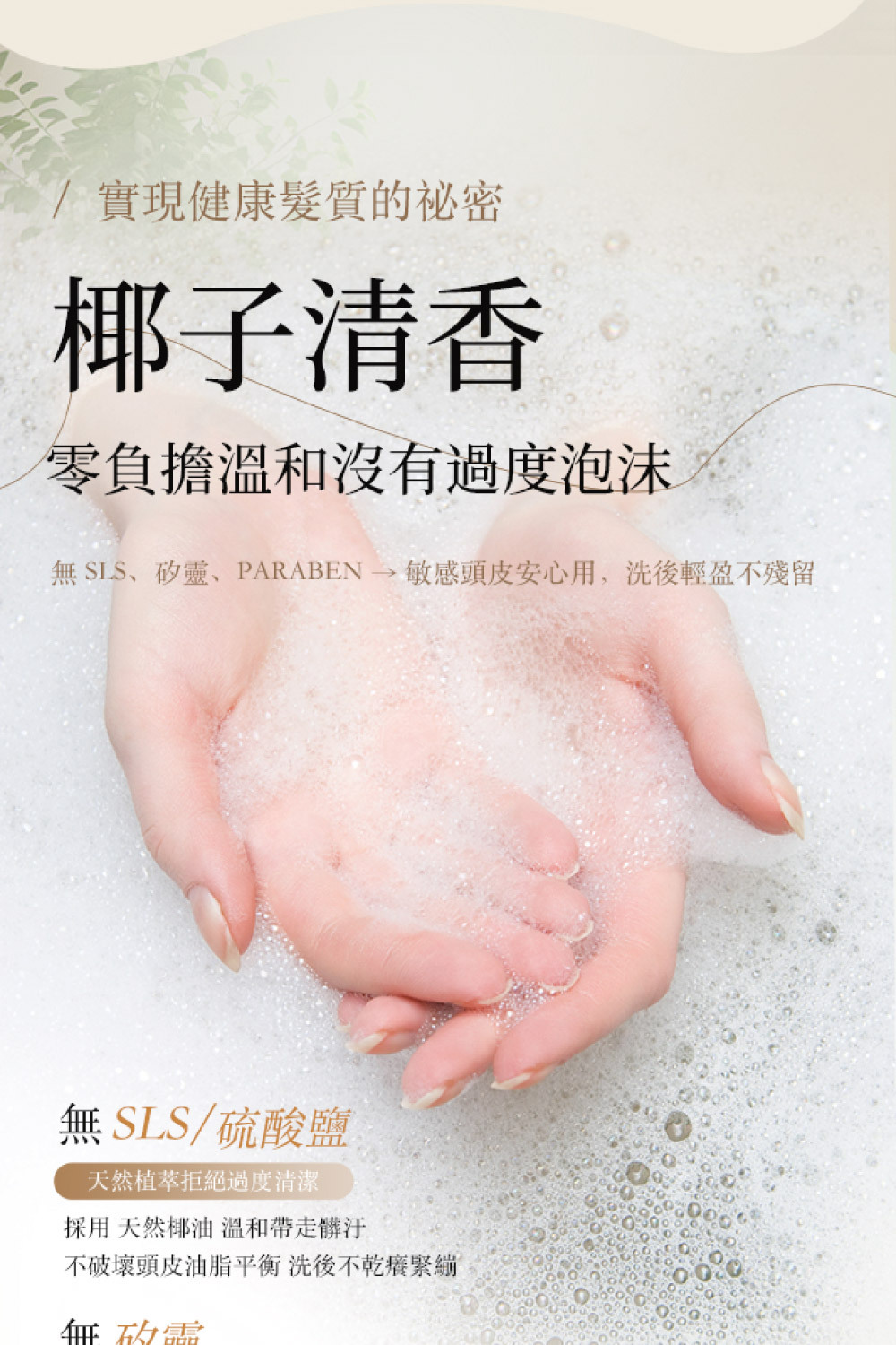 • 不含 SLS、矽靈、Paraben,溫和洗淨,適合各種髮質,特別是乾燥與受損髮