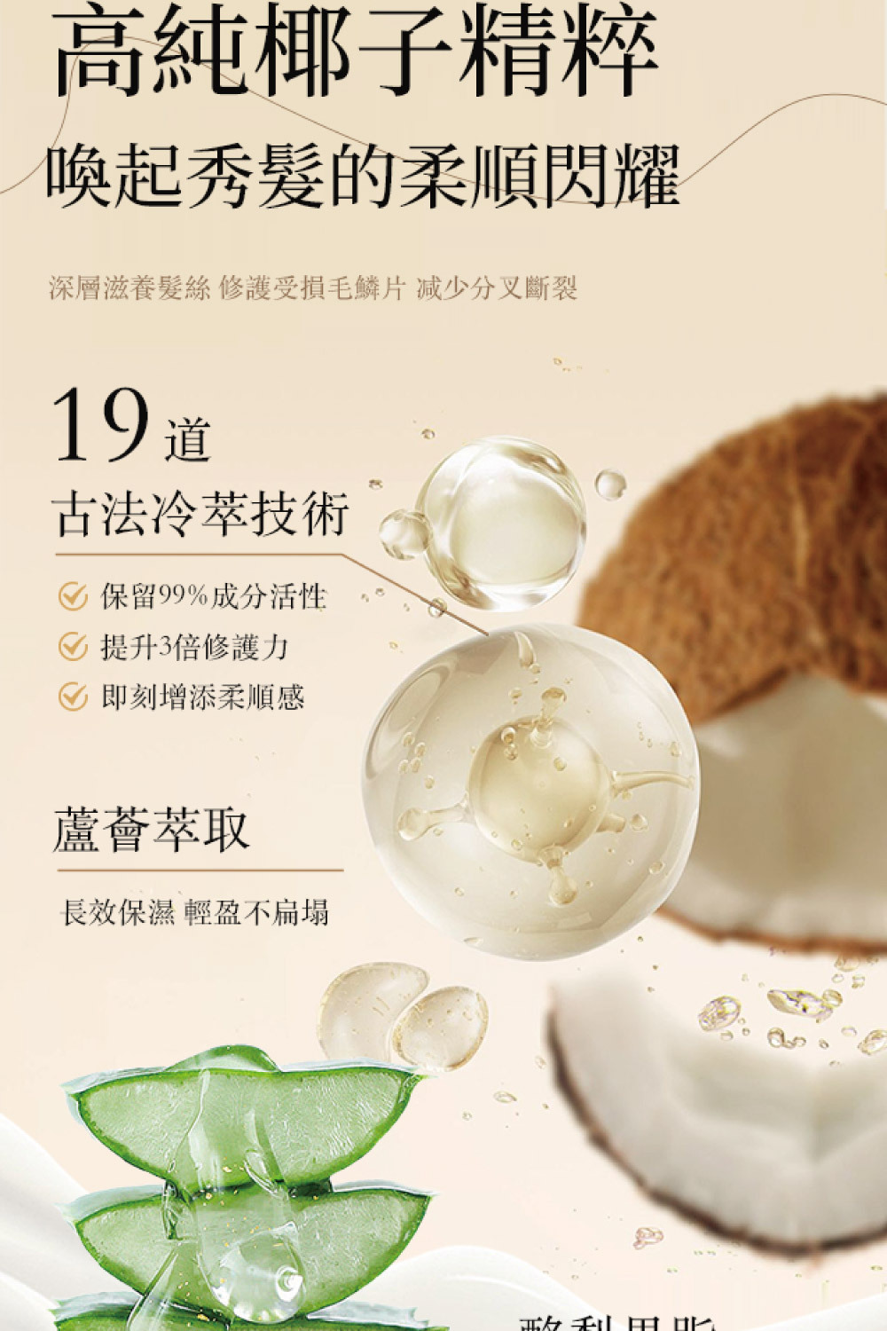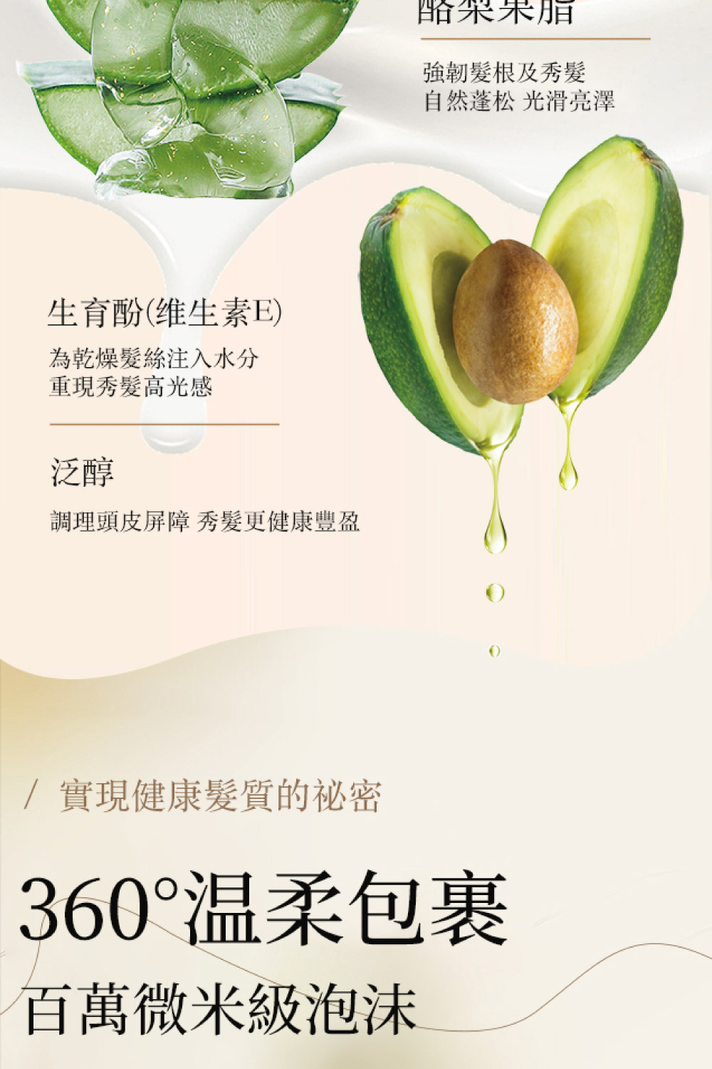 • 蘆薈與酪梨萃取,提供天然保濕,讓髮絲水潤輕盈