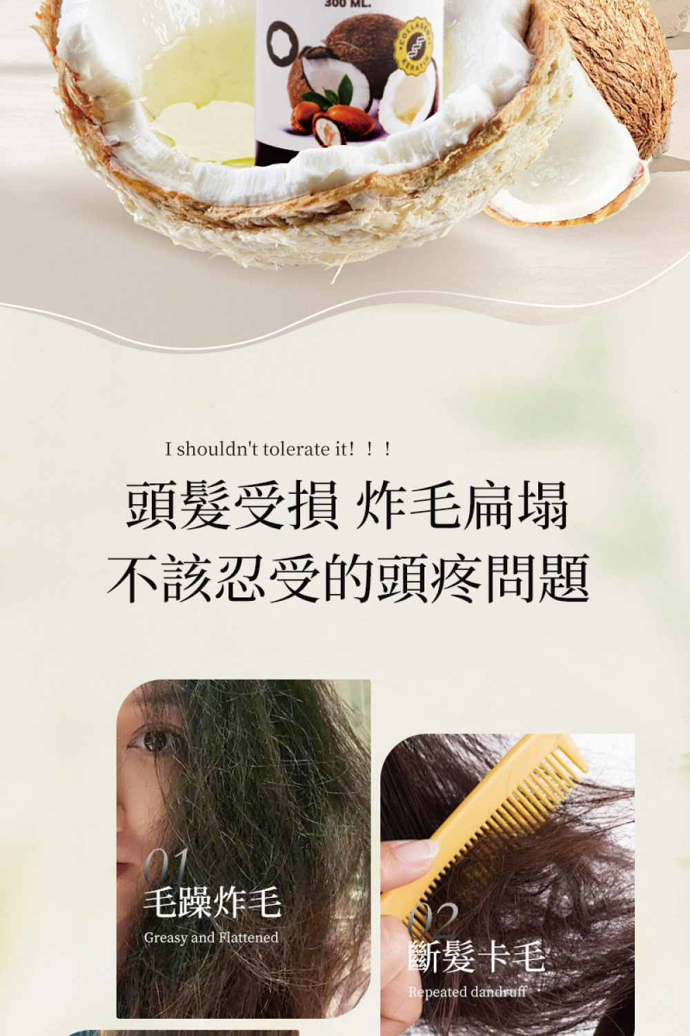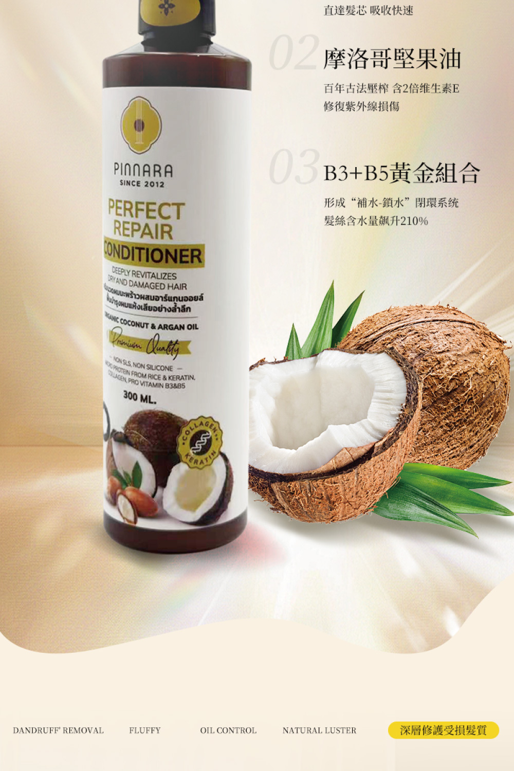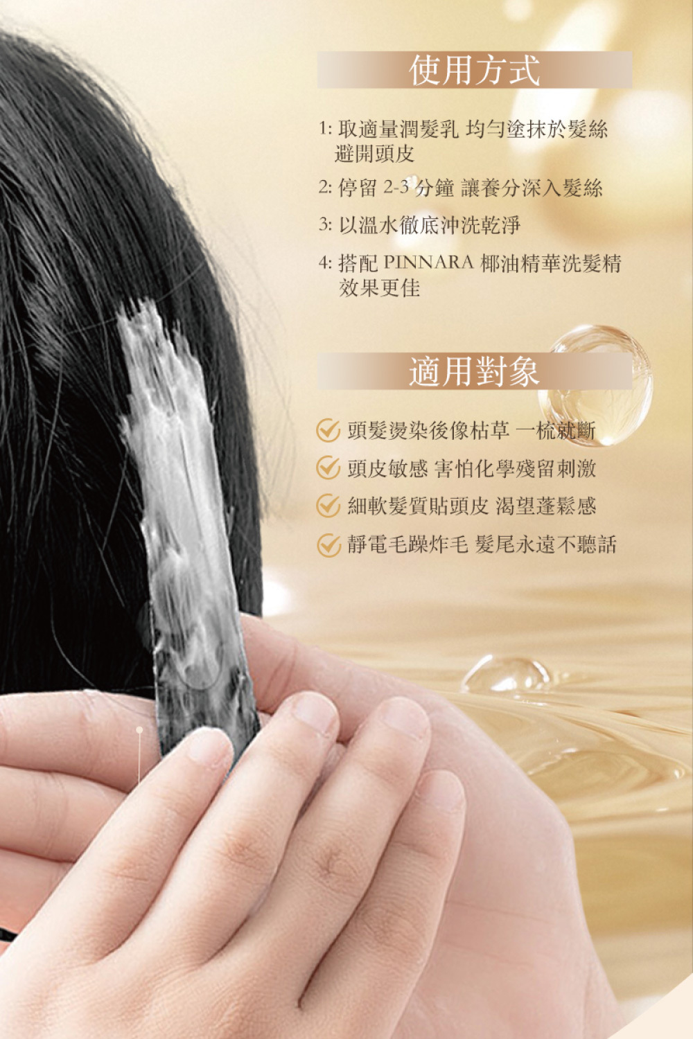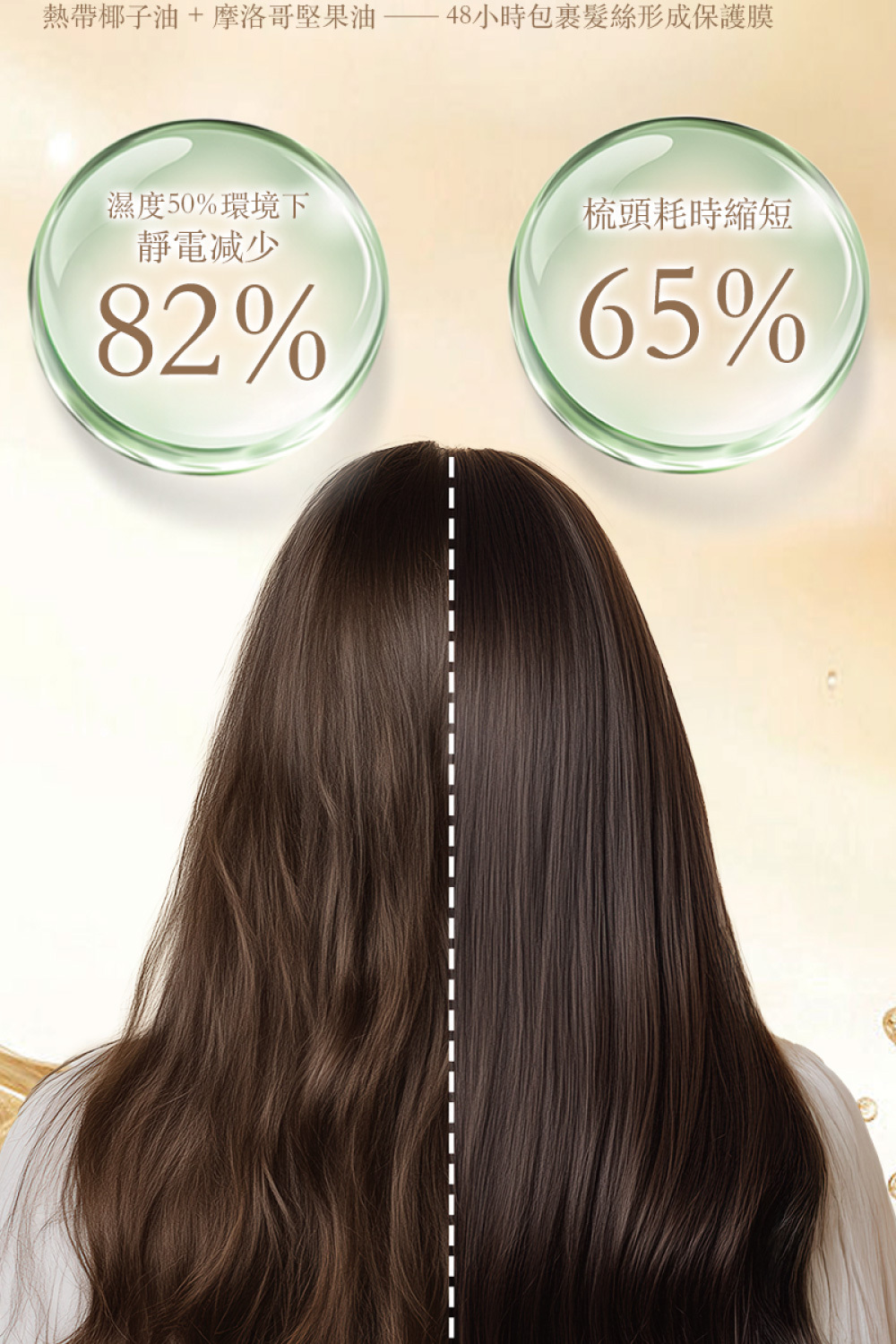 • 採用有機椰子油及摩洛哥堅果油,深層滋養秀髮,使髮絲柔順有光澤