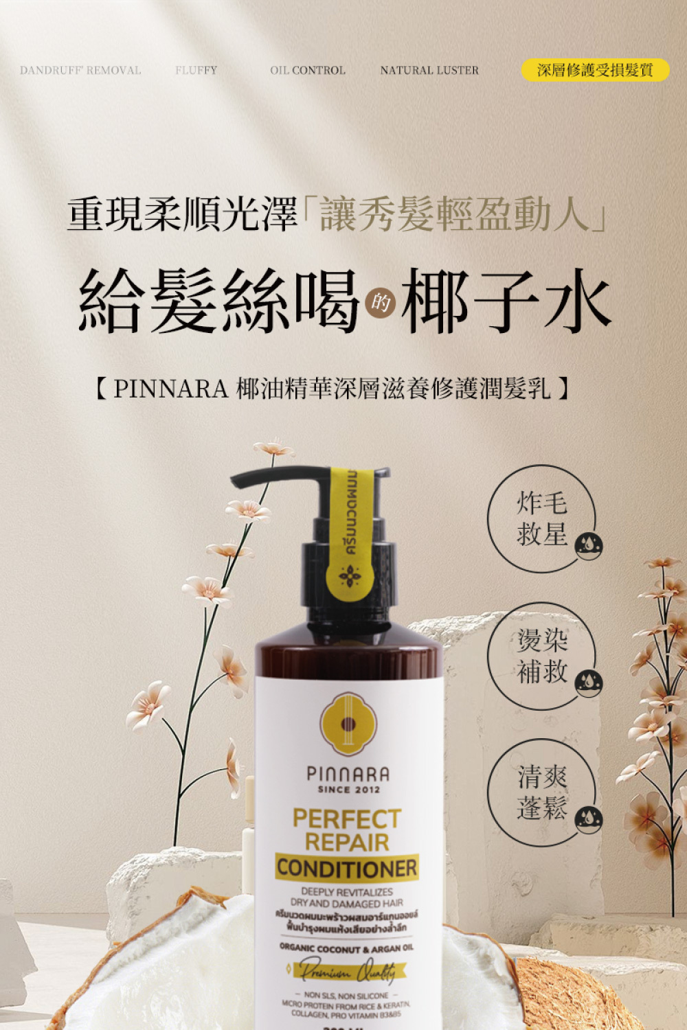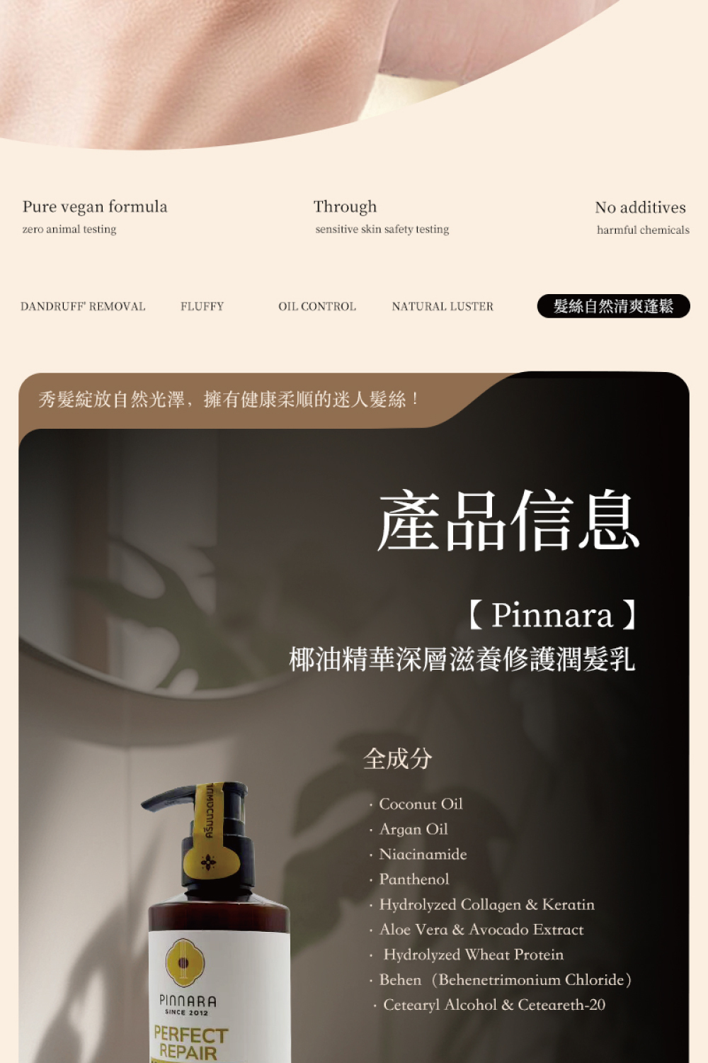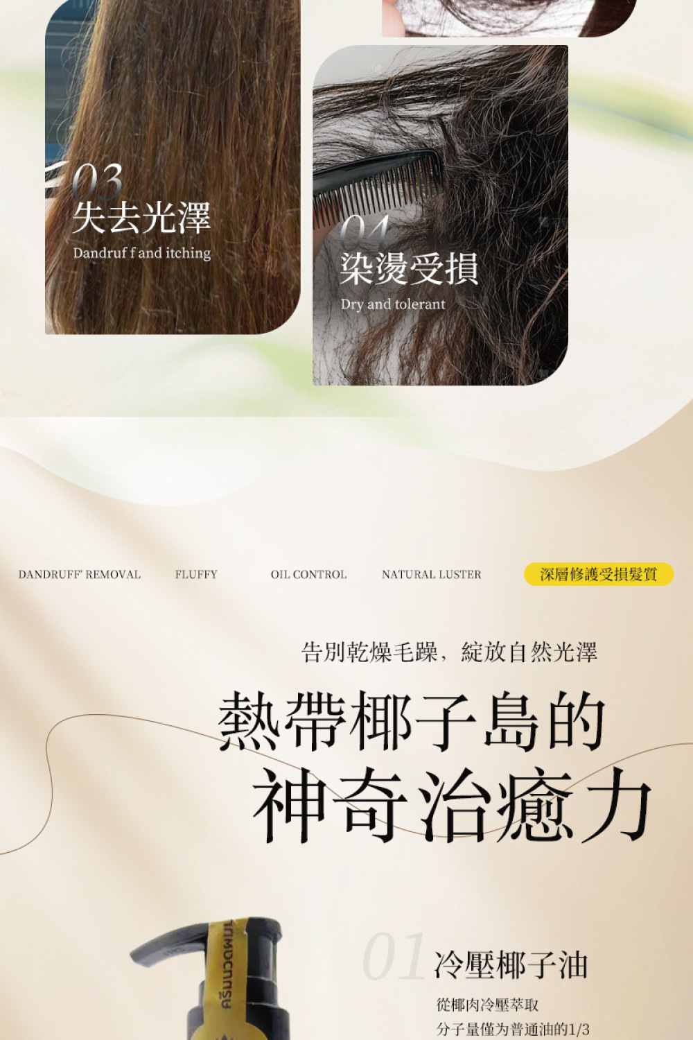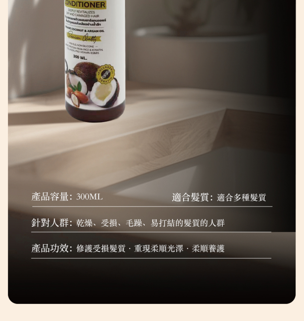 • 採用有機椰子油及摩洛哥堅果油,深層滋養秀髮,使髮絲柔順有光澤