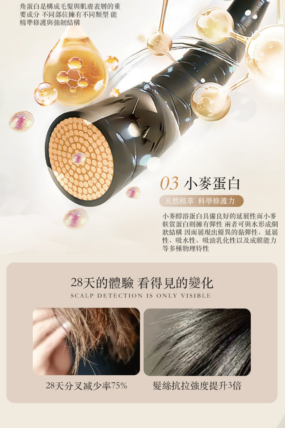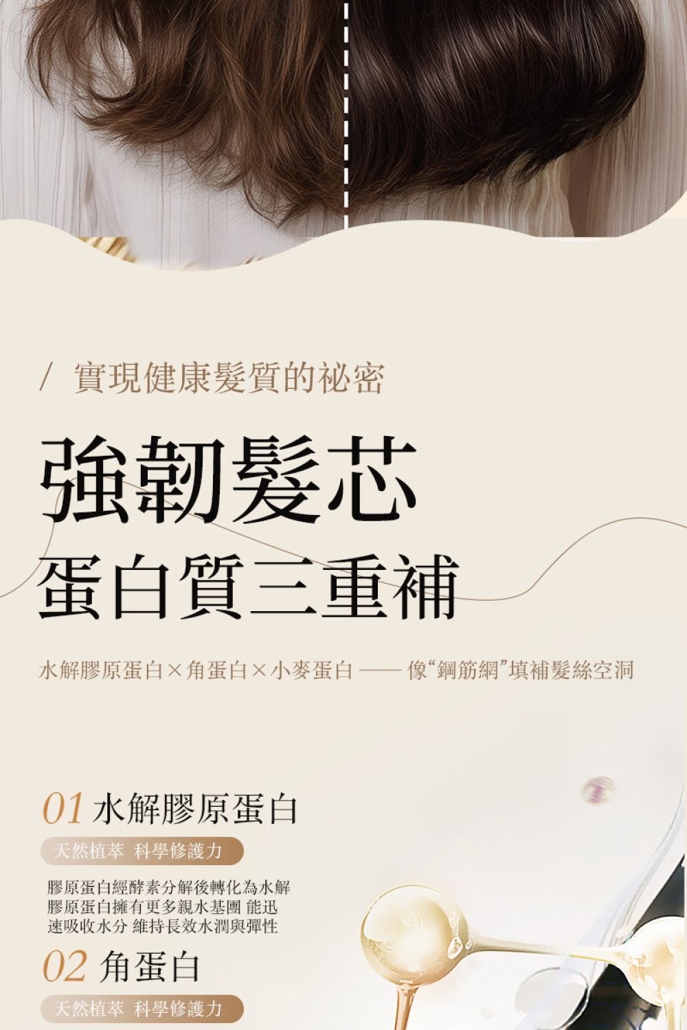• 添加 水解膠原蛋白、角蛋白及小麥蛋白,幫助強韌髮絲,防止毛躁與斷裂