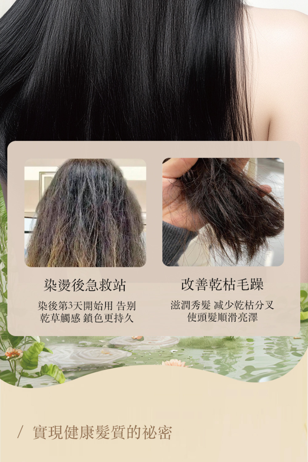 • 富含 維生素 B5 及 B3,修護受損髮質,增強髮根強韌度