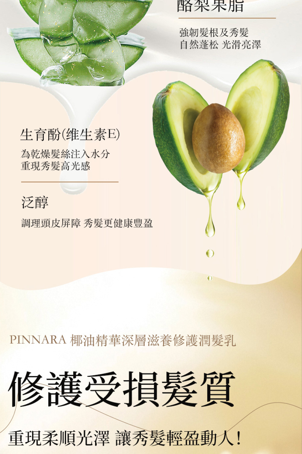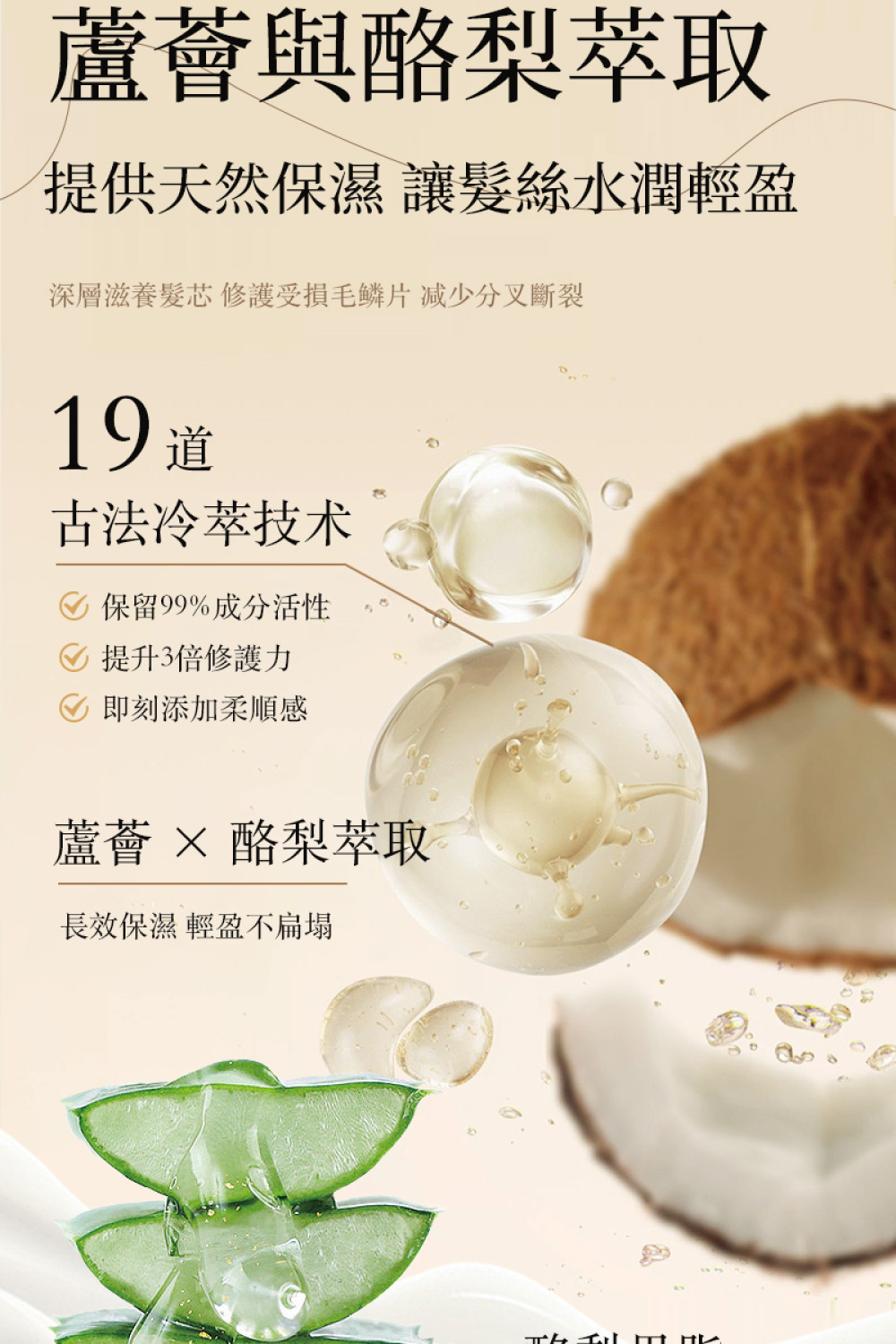 • 蘆薈與酪梨萃取,提供天然保濕,讓髮絲水潤輕盈