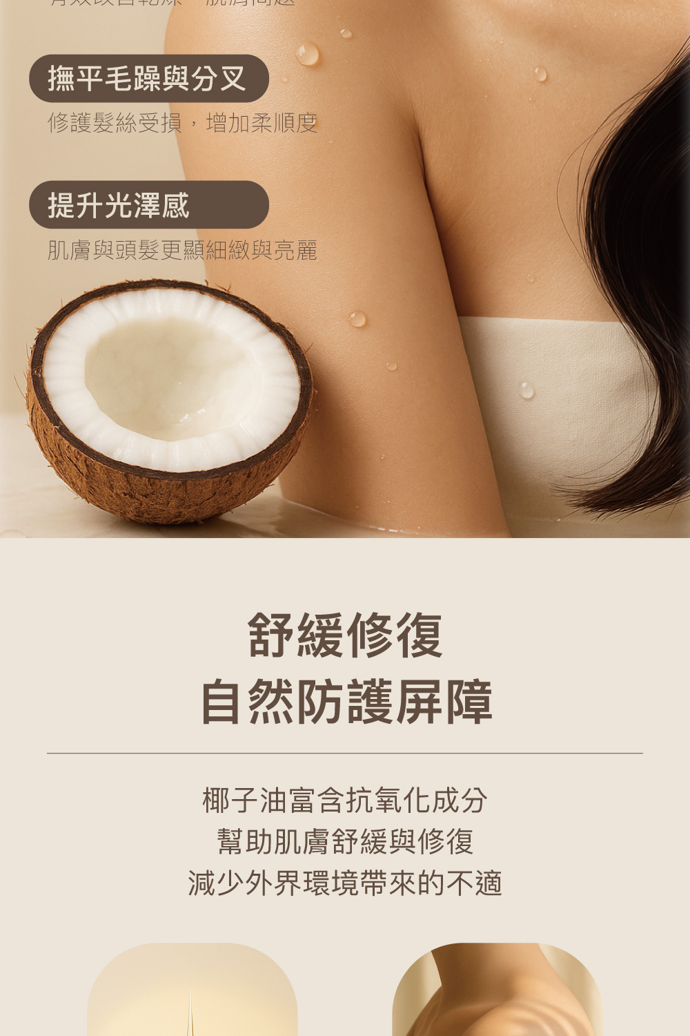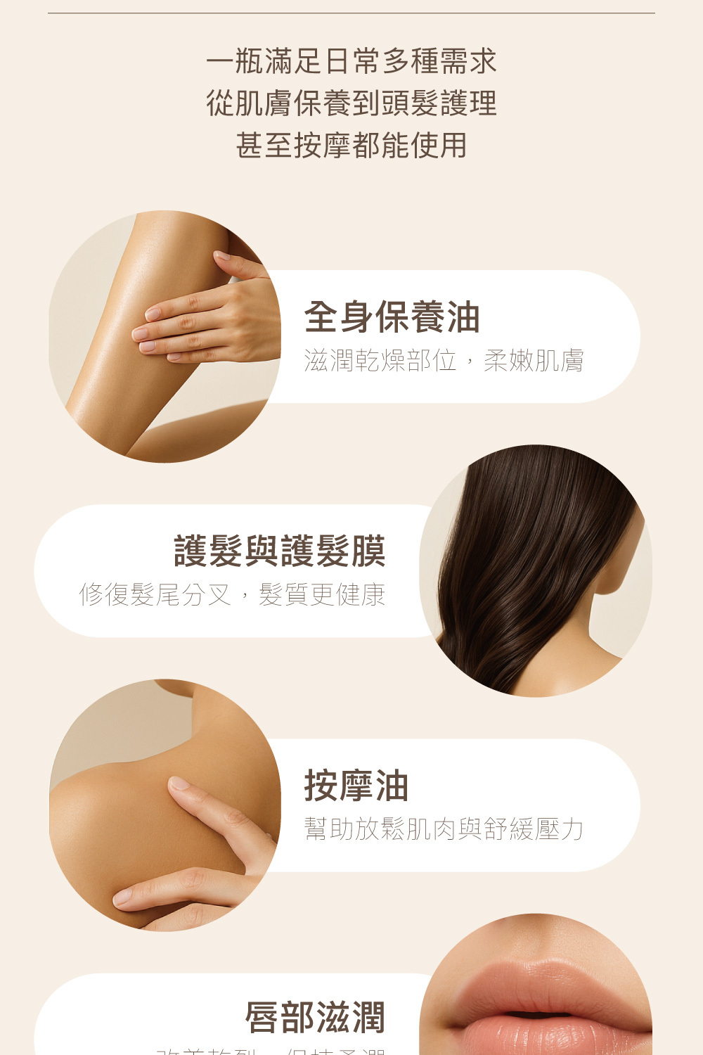 • 滋養保濕 • 深層潤澤肌膚與髮絲:修護乾燥、撫平粗糙,回復絲滑觸感