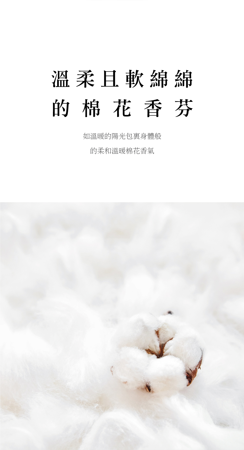 • 如溫暖的陽光包裹身體般的柔和溫暖棉花香氣