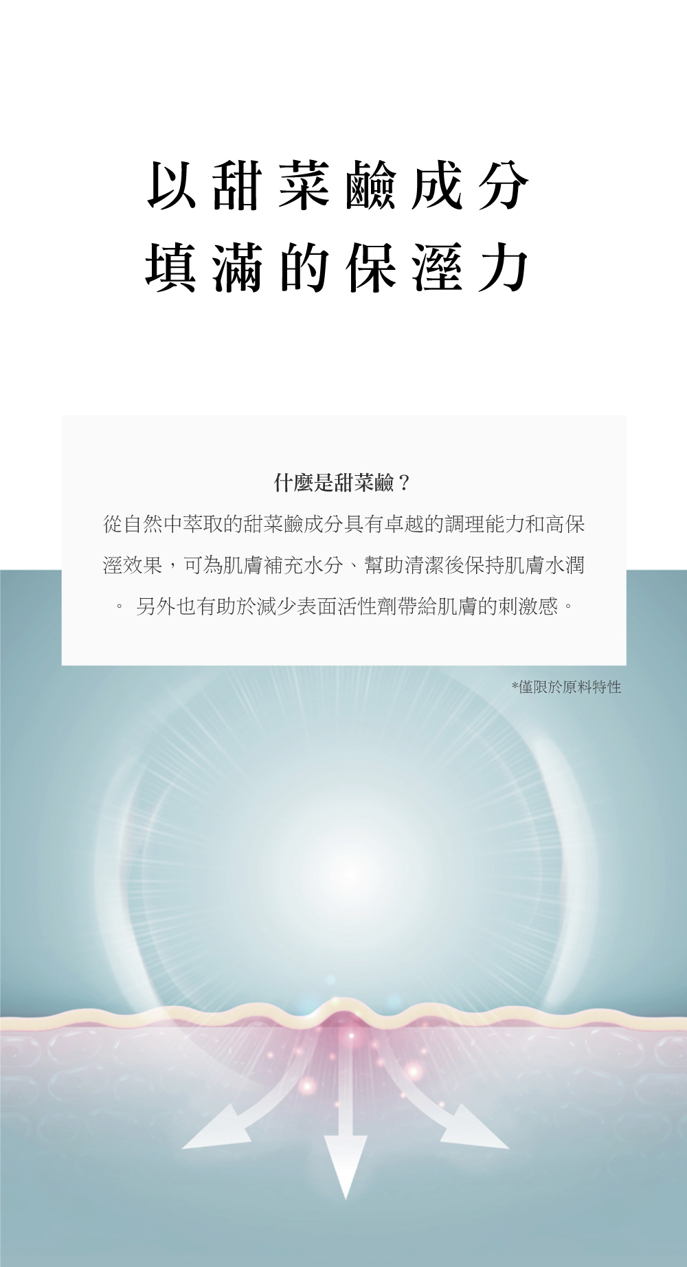 • 含有甜菜鹼成份具有卓越的高保濕效果為肌膚補充水份