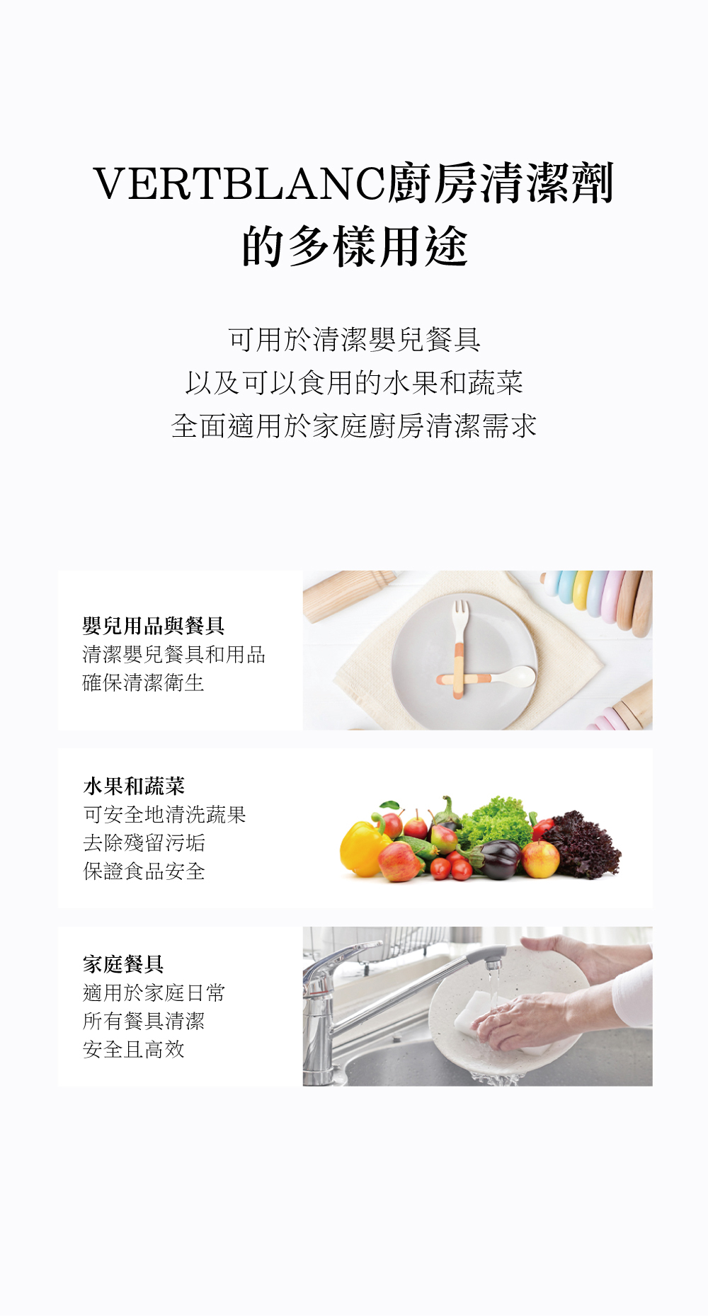 • 使用天然植物的清潔成分,適用於水果、蔬菜的安全廚房清潔劑