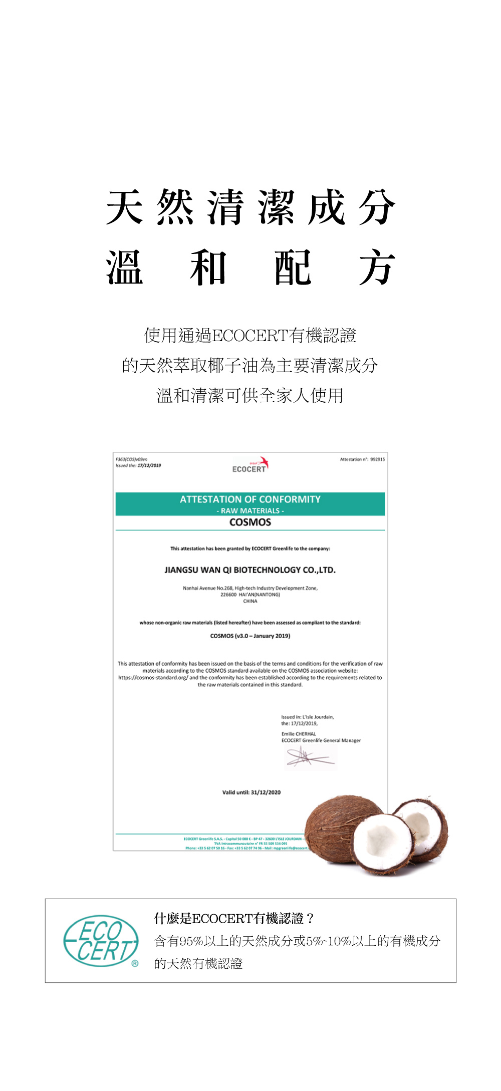 • 使用通過ECOCERT有機認證的天然萃取椰子油為主要清潔成分