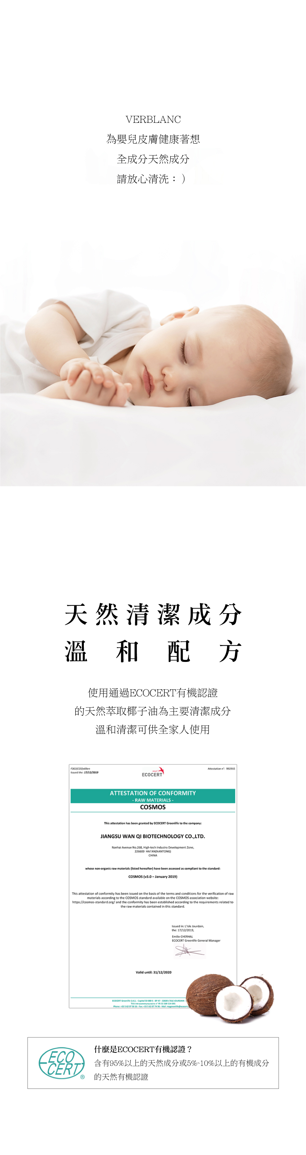 • 使用通過ECOCERT有機認證的天然萃取椰子油為主要清潔成分
